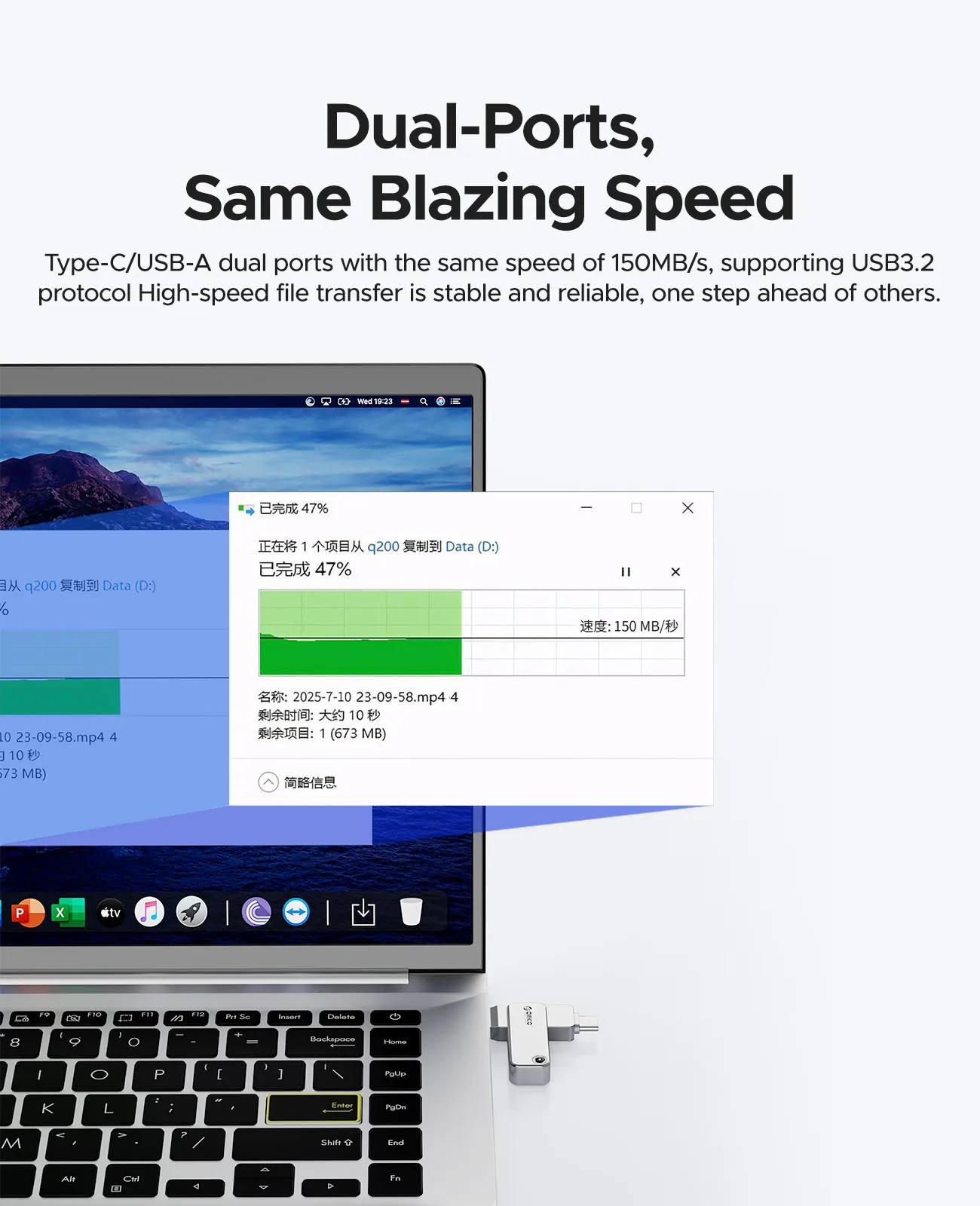 Using the USB3.2 Gen1 high speed transmission protocol, High-speed USB3.2 Gen1 Performance of Read Speed Max 150MB/s, Write speed up to 70MB/s. you can transfer 1 GB File in less than 3 seconds .