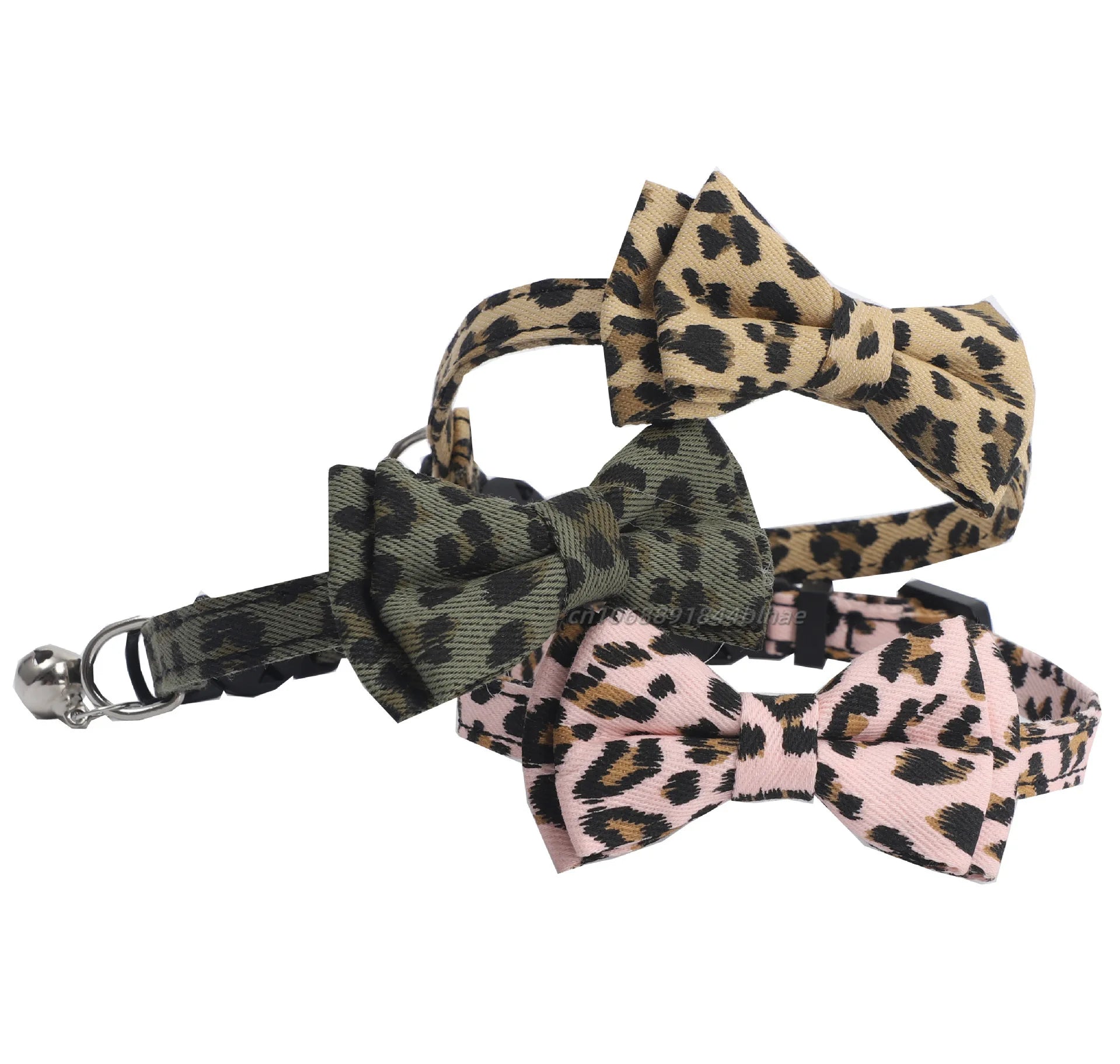 Pet Leopard Cat Collar with Bell Adjustable Puppy Bow Necklace Outdoor Safety Anti-choking for Small Pets Walking Accessories