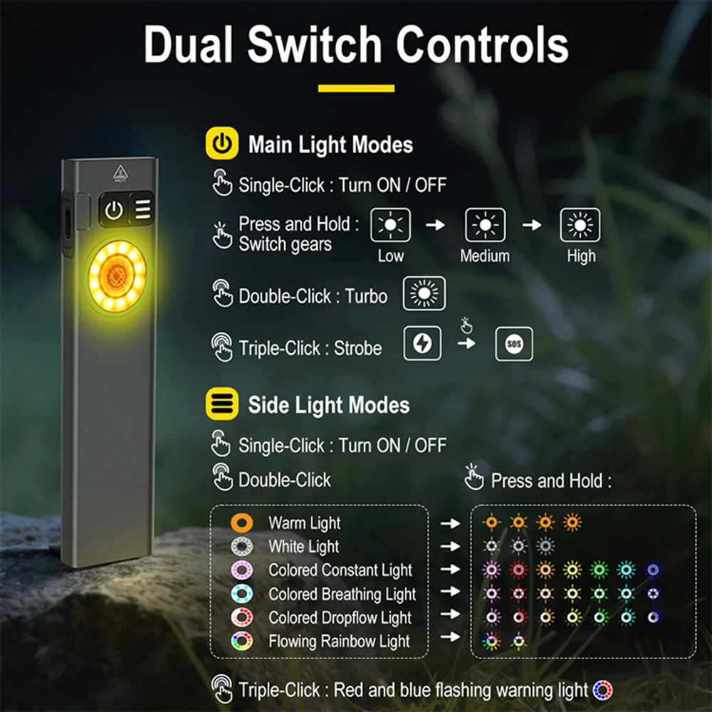 Click on the main light switch to turn on the main light, long press to shift: low light - medium light - high light, click to close any gear with memory, double-click to enter extreme light - click to close, triple click to enter: flash - long press SOS - click to close