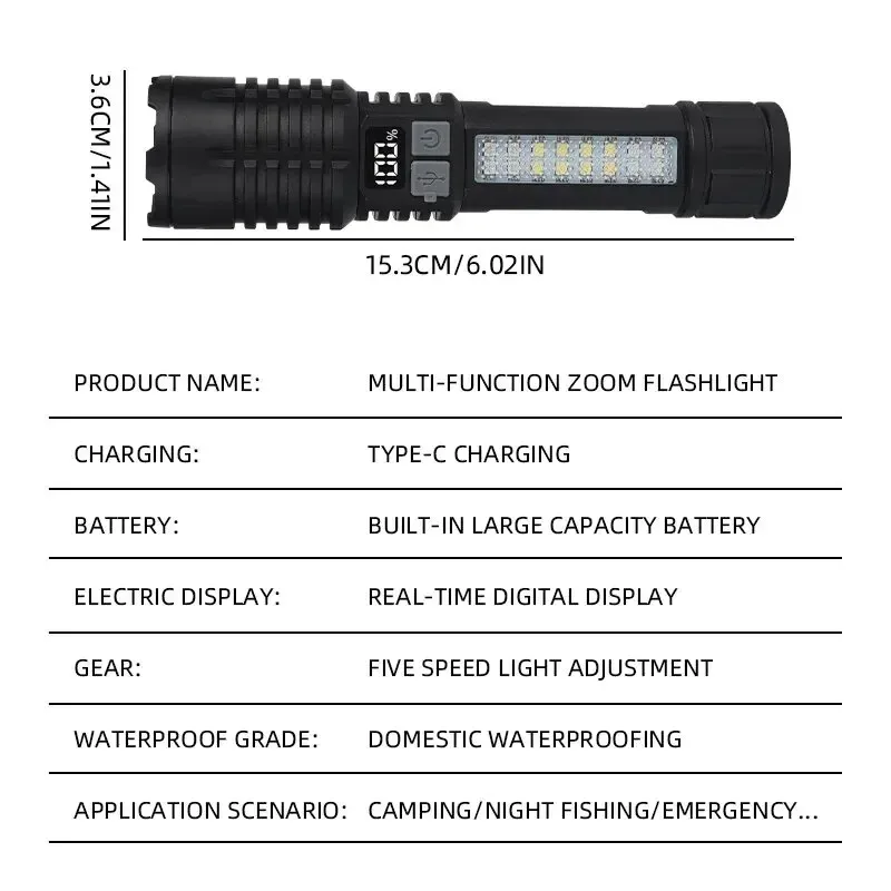 The telescopic zoom feature allows for versatile lighting, from wide area illumination to focused beams, enhancing its utility in various scenarios.