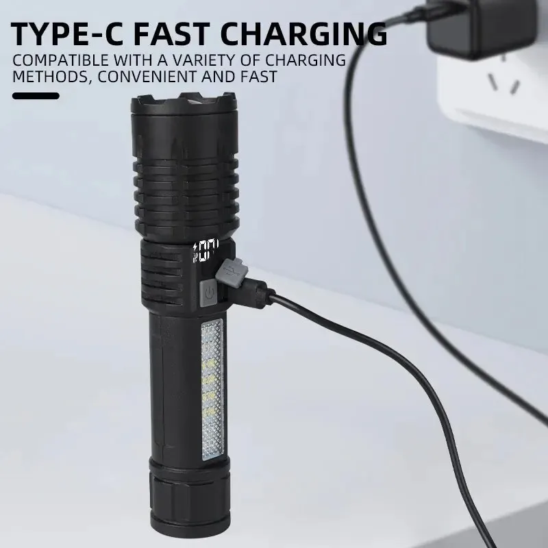 Tactical LED Flashlight High Power USB Rechargeable Camping Torch with Telescopic Zoom Emergency Spotlight Built-in Battery