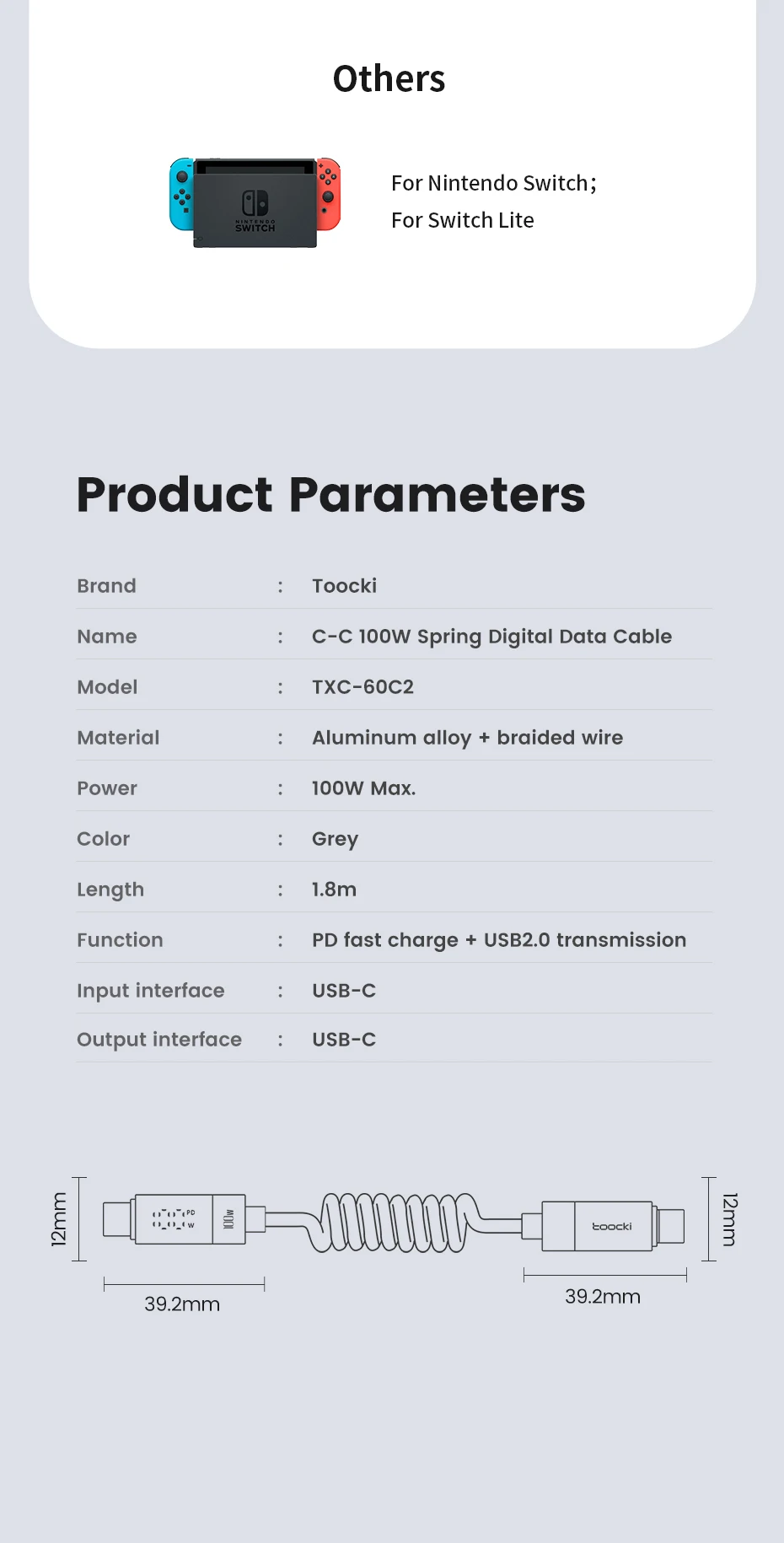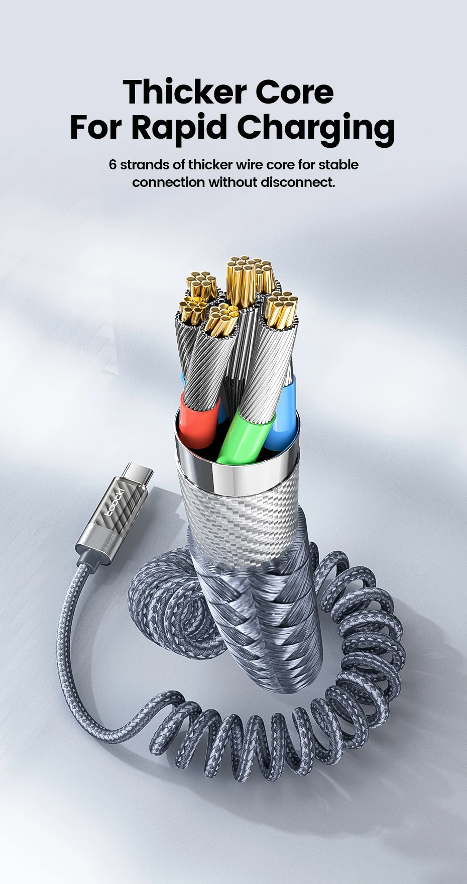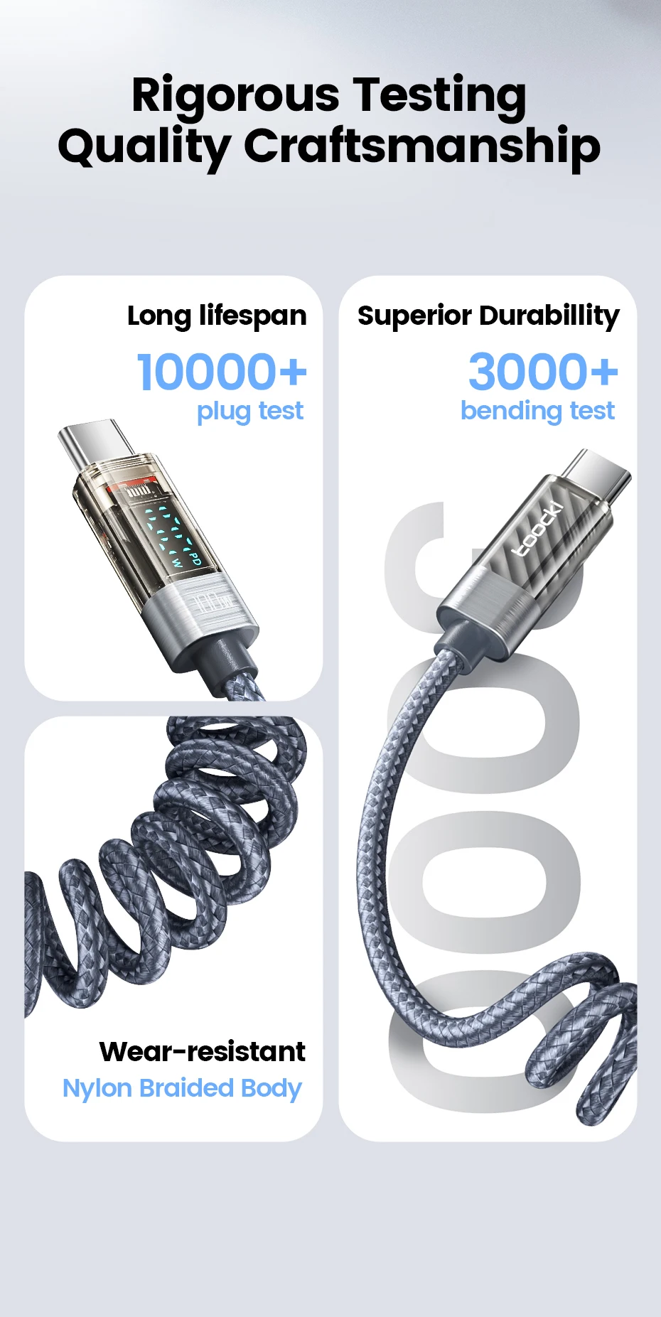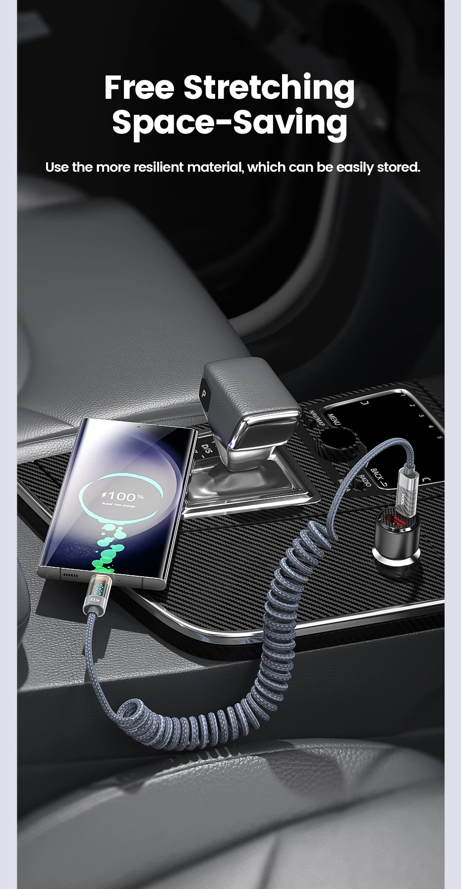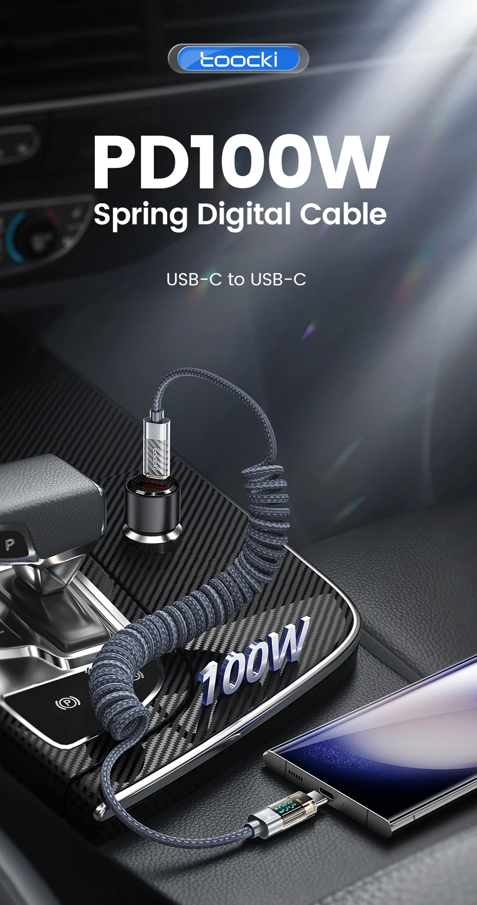 [PD 100W Spring Digital Cable] USB-C to USB-C 100W Output Max Spring Retractable Transparent Digital Display Fit For Vehicle/Home