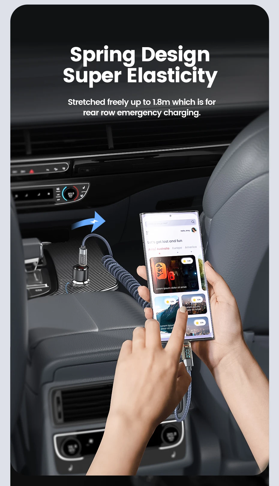 [Spring Design Super] Elasticity Stretched freely up to 1.8m which is for rear row emergency charging.