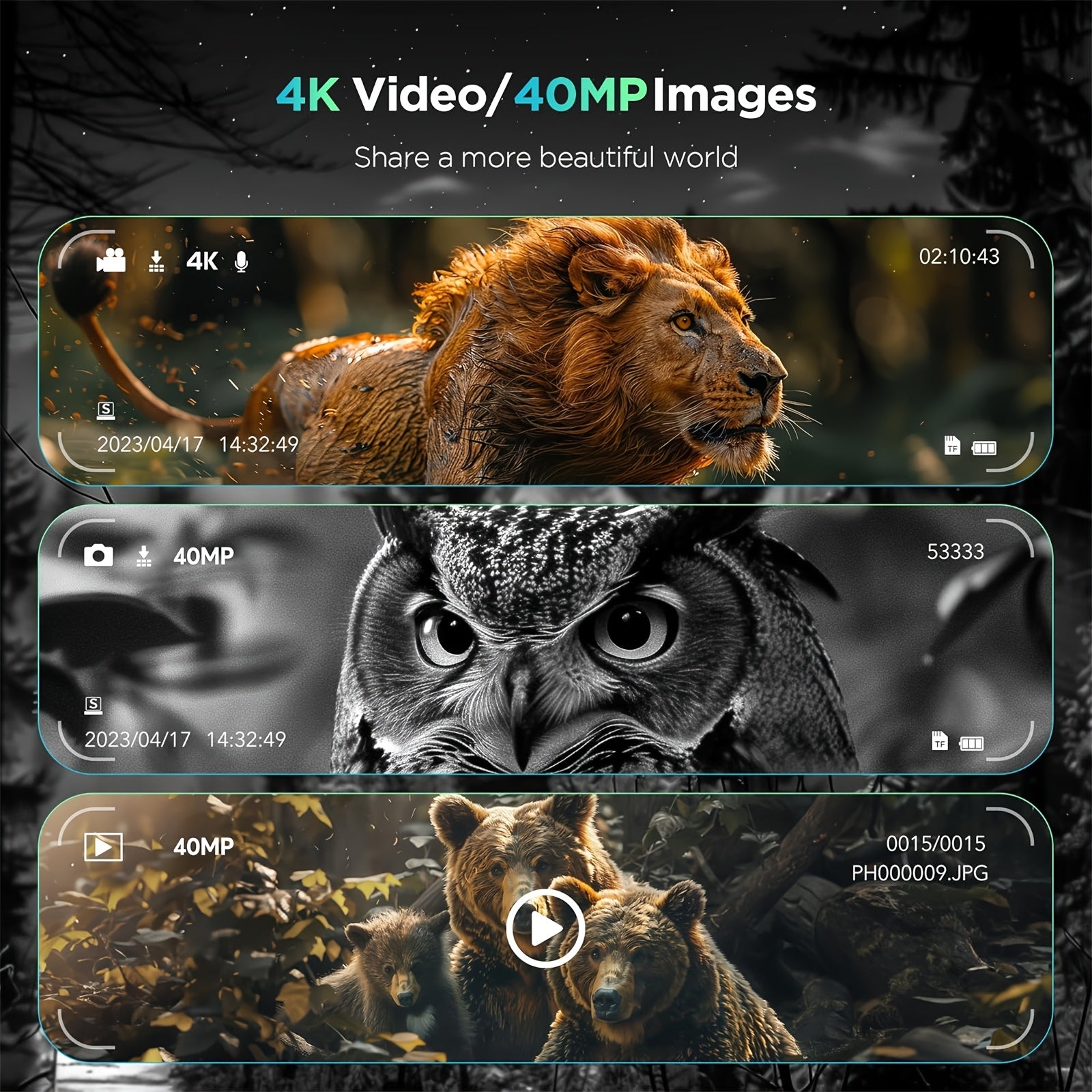 [Full HD 4K Video and 40 Megapixel Images]: infrared night vision telescope with 8x zoom. Captures animals running, resting, etc. with great clarity.